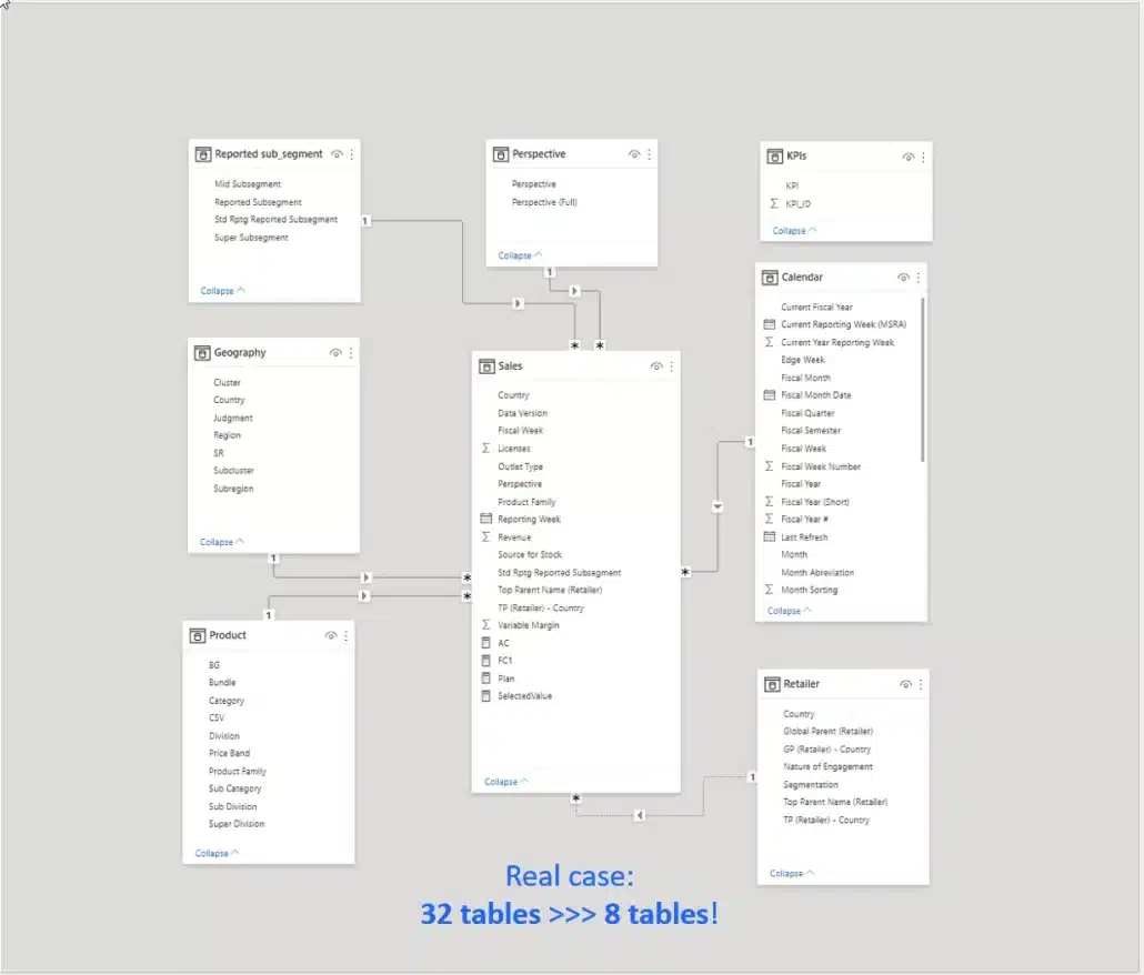 This data model actually delivers the same functionality as the previous one. However, it is created using a simple star schema and leverages only the necessary columns. The DAX formulas we used are very simple. As a result, we've managed to reduce the number of tables in the model from 32 to 8 and make it 5 to 10 times faster for typical data queries.