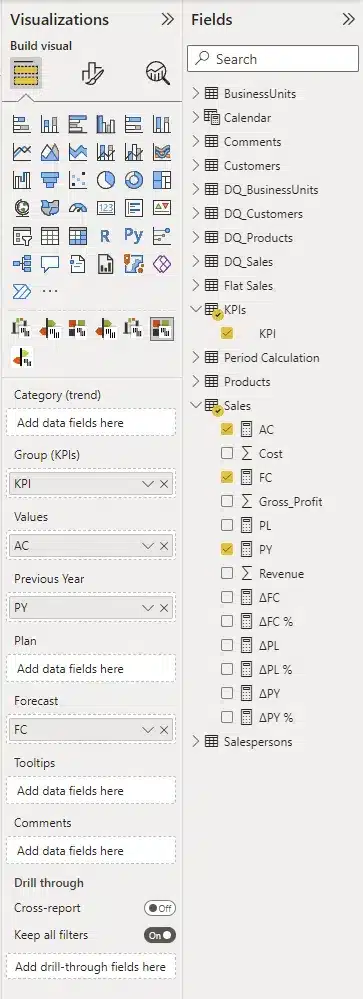 Now, we add the Zebra BI Cards custom visual and add it to our report. You then need to add individual measures (actuals, previous year and forecast) and group them by KPIs.