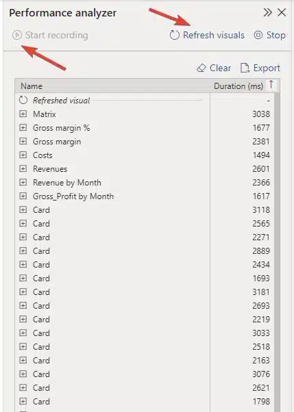 In the Performance Analyzer pane, hit Start recording and then Refresh visuals. Power BI reloads visuals and records how long each of them takes to load.