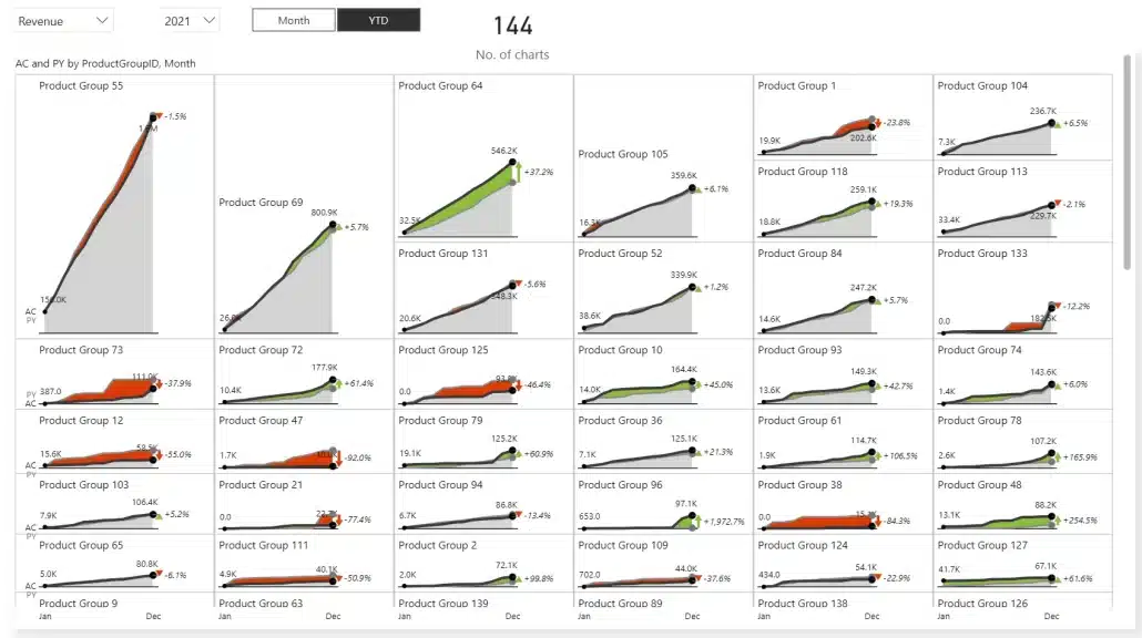 This report is running in Import data mode and is ridiculously fast. Of course, adding more charts will slow down the performance somewhat. As a test, we've created a report with 144 charts – one for each individual product.