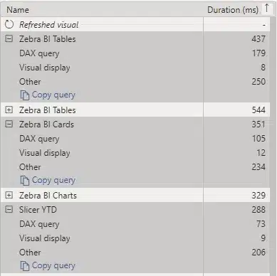 This one indicates how long it took for the visuals to load before the Zebra BI Tables could, which lets us know that there are simply too many visuals on the page.