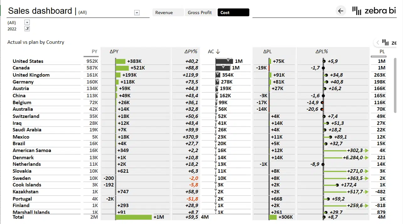 By including comparisons and variances, we're telling a much more interesting story from the get-go even though we're using the exact same data. A quick glance is all it takes to see the biggest gains and losses and the countries that contribute the most to your overall results.