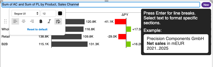 - Introducing line-breaks and multi-line support for titles for better visual hierarchy, IBCS compliance and information architecture. Now segregate distinct data categories, such as time periods and comparison scenarios, into vertical stacks avoiding cluttered, hard-to-read title strings.