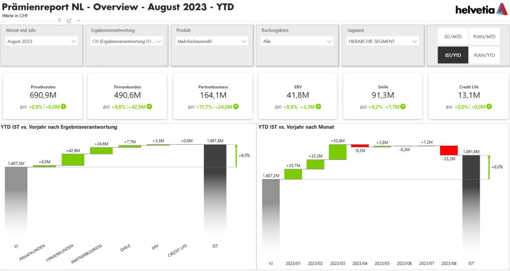 The team worked closely with Zebra BI to address early challenges, such as handling direct hierarchies and enabling waterfall charts. With these improvements now in place, Zebra BI has become deeply embedded in Helvetia’s reporting processes.