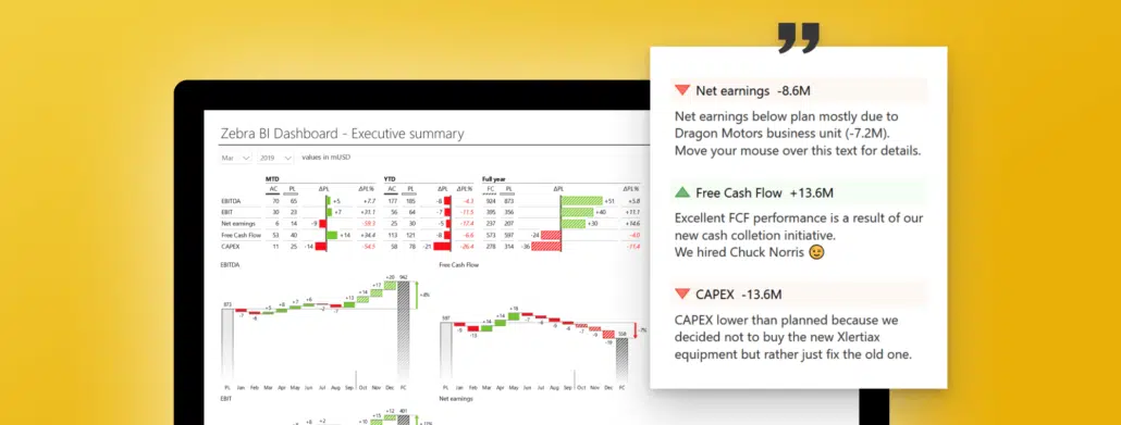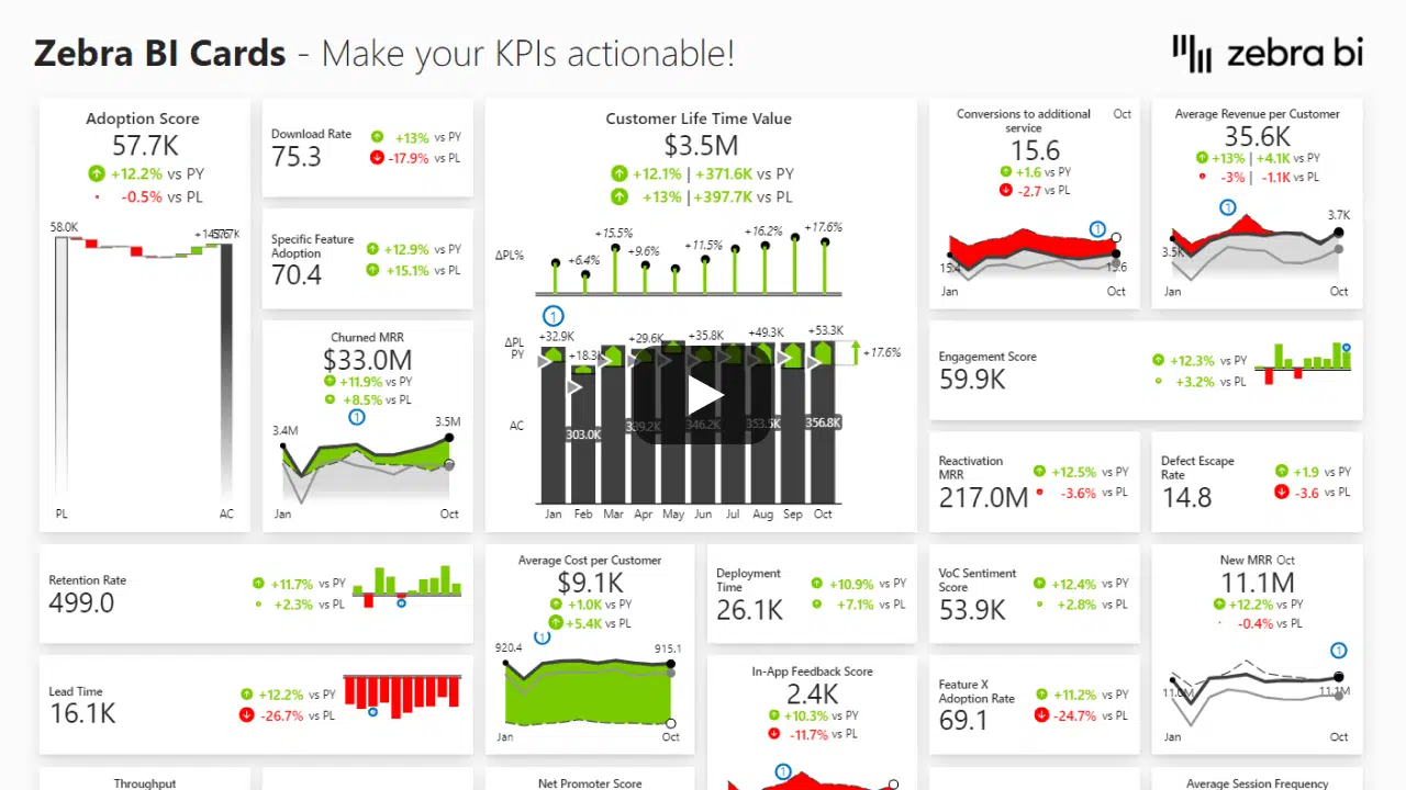 Combining Zebra BI Cards with Zebra BI Charts and Tables, you will get a complete toolkit for actionable reports and dashboards in Power BI. Tell your company's story by showing top-level data and a more detailed explanation of numbers all in one page.