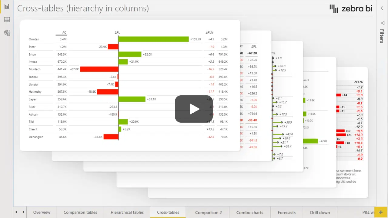 Zebra BI Tables is the most powerful table/matrix visual in Power BI and features charts with a vertical axis and various table-chart combinations. These charts are used for visualizing structure data such as products, customers, regions, accounts, business units or cost centers.