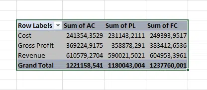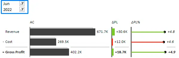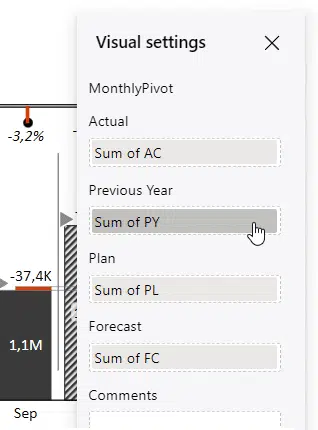 This will insert a simple table visualizing your three core KPIs – revenue, gross profit, and cost. Make sure all the values are in the right placeholders. If you're comparing your actuals to the plan, your Sum of PL value should be in the Plan placeholder, not the Previous Year one. Click on the gear icon and simply move it accordingly.