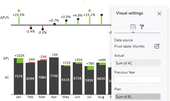 Now, insert the second Zebra BI visual: Zebra BI Charts for Office. With your current values, you get a chart showing your actuals up to the current month and plan values for the rest of the year. Just make sure to move the plan values into the right placeholders in the chart settings (gear wheel icon).