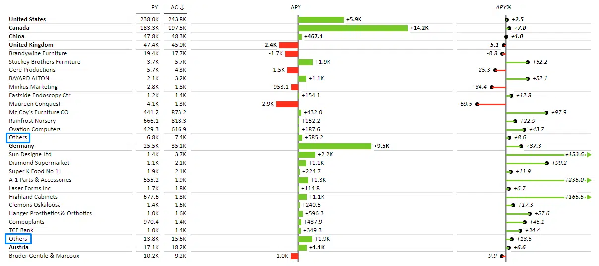 A plain table with a bunch of figures gives you no sense of which country is the largest market, which are the best performers, and which, on the other hand, need some attention. By visualizing your data, you get a much better insight. Moreover, this enables your users to sort and resize the table to get a better grip on your data.