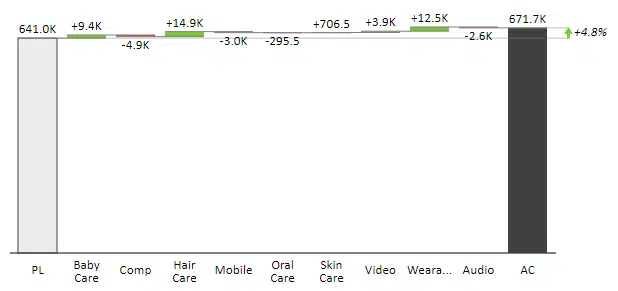 To increase information density, you can add the data for the previous year, and Zebra BI Tables will automatically calculate the variances between this data point and your actual results. This great feature completely eliminates the need for manual calculations, saving you tons of time and effort. You can find it in all Zebra BI visuals.