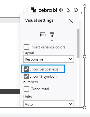 The chart shows the contribution of each business unit to the plan. However, the horizontal axis chart is more suitable for a time series, which is why we should rotate it by 90 degrees. Click on the chart settings and select the Show vertical axis option.