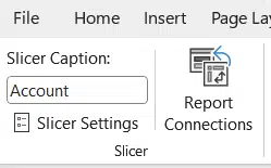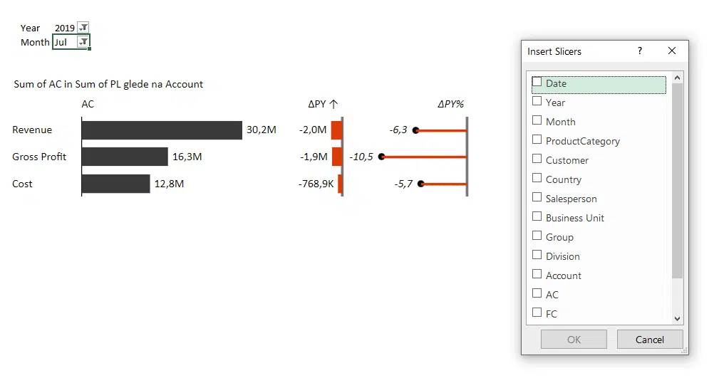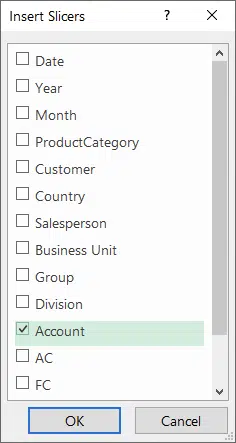 One of the things we're missing to make this dashboard truly interactive is a slicer for switching between KPIs. To do this, click on your Account PivotTable and select Slicer on the Insert tab in Excel. A window pops up in which you should select the Account measure, which actually contains the Cost, Gross profit, and Revenue values.