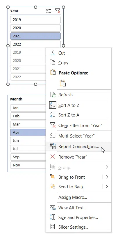 Select the Year and Month slicers. This will create two slicers on your dashboard. However, these two slicers are now only linked to one Pivot Table and not both. So, any selection of months or years made in the slicers only affects the original pivot table.