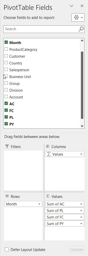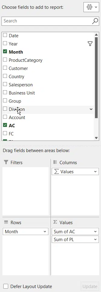The first step is to add Year and Month Fields as filters to our Pivot Table. Click on them and drag them to the Filters area of your PivotTable Fields pane.