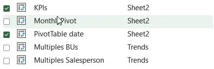 This will open up a new selector window with a list of all the PivotTables in the whole workbook. Here, you tick the PivotTables that you want the slicer to control. You want your filter to change the date and the KPIs in your PivotTables.