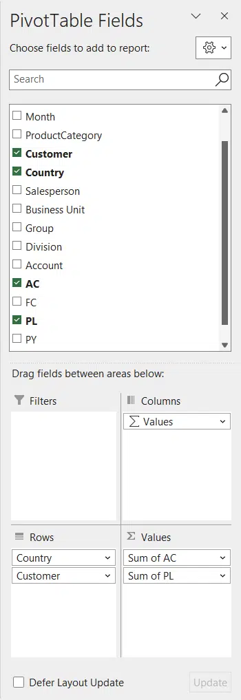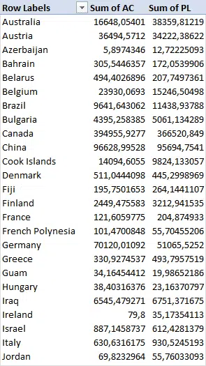 The next step is to add a breakdown by country. Start by copying your first PivotTable, removing the fields you no longer need, and adding the ones you do. In our case, we'll keep AC and PL values and place the Country value into the Rows area in the PivotTable.