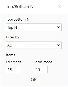 Then, set the options. Select Top N and set the number of items under Edit mode to 15. This will have your Tables visual show the top 15 countries only.