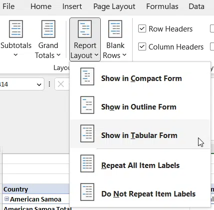 If you get a parsing error, just click on your PivotTable, open the Design tab, and set the Report layout to Show in tabular form.