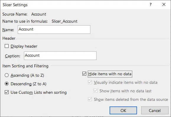 Go ahead and remove the heading, set the sorting order to descending and select Hide items with no data.
