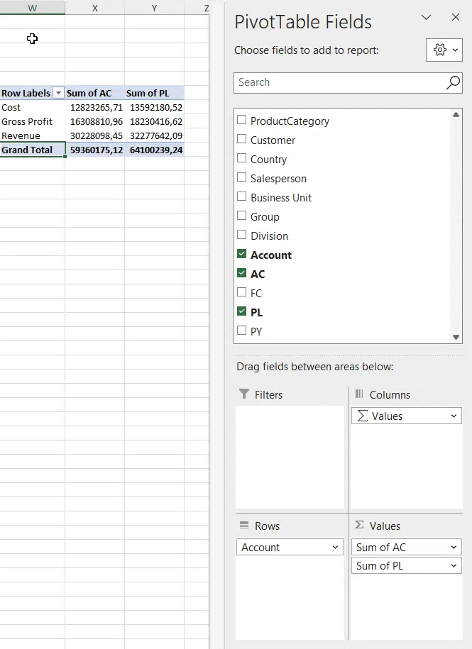 Now, click on the newly inserted PivotTable and add some fields. The first one to add is the dimension Account – place it into the Rows area. Next up are your actual (AC) and plan values (PL), which you should add to the Values area.