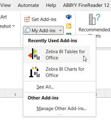 Ensure you install both Zebra BI Tables for Office and Zebra BI Charts for Office. Once downloaded, the add-ins become available in the Insert tab on your tool ribbon. Click the My Add-ins button and select the desired add-in from the available options.