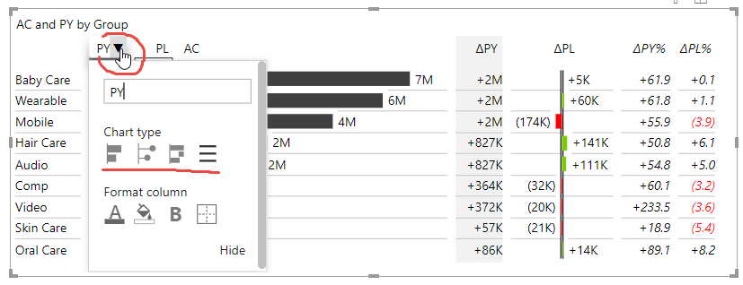 - Small multiples with extended charts! Works for the following column chart layouts: Actual/Absolute, Actual/Relative, Absolute/Relative