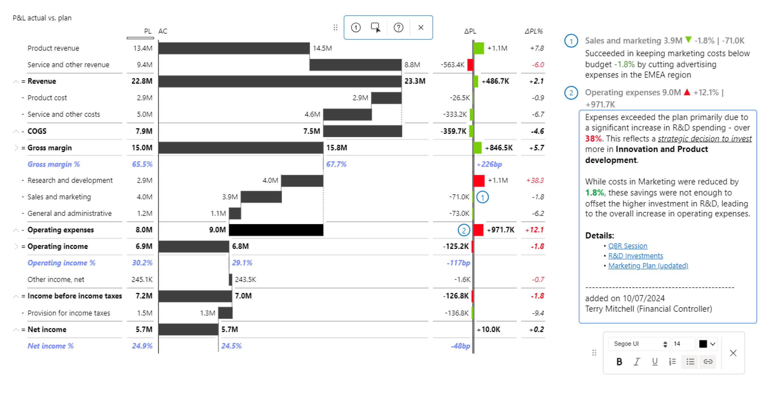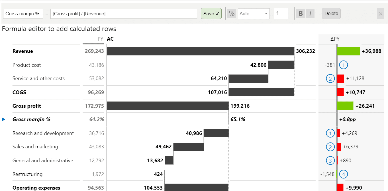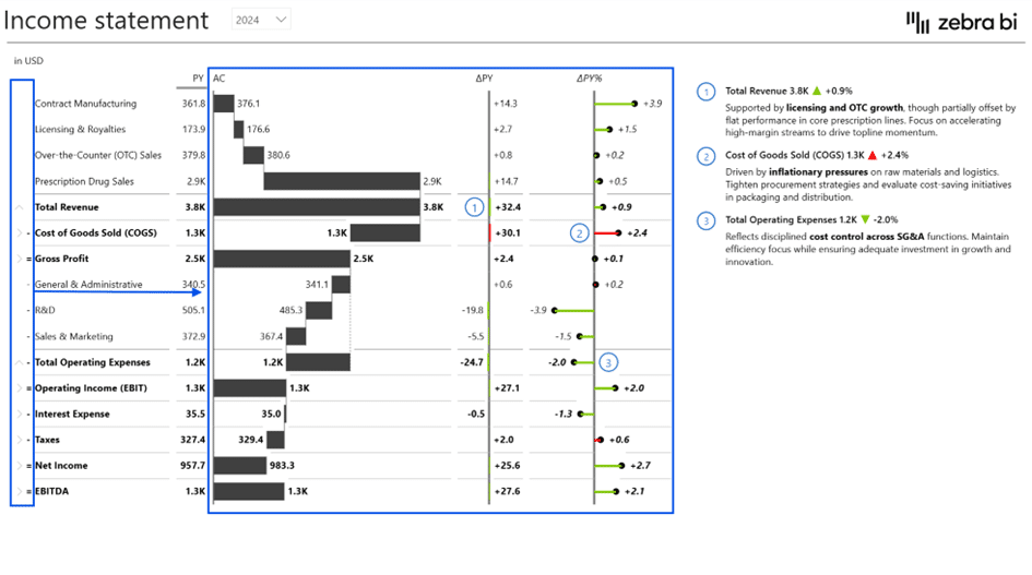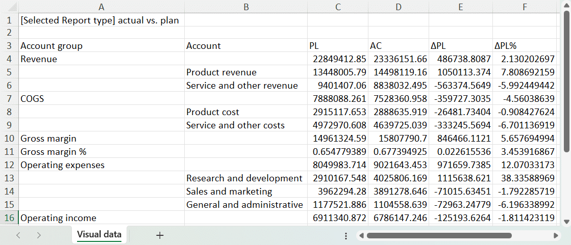 The output file is not formatted, allowing you to focus on deep analysis, including Zebra BI on-visual calculations and comments.