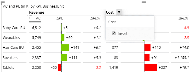 - Added support for inverting a selected chart in small multiples. Very useful in cases where a KPI dimension is used in small multiples to show different measures, for example, Sales, Costs, and Profit. In this case, the whole chart for costs needs to be 'inverted' to properly show the variances (toggle the red/green color). You can do this by right-clicking on the title of a chart in multiples and then selecting Invert from the context menu.
