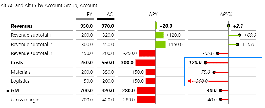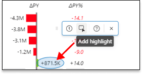 - Fixed an issue with vertical axis chart where the difference highlight is calculated only up to the axis point for single measures with a negative total or subtotal.