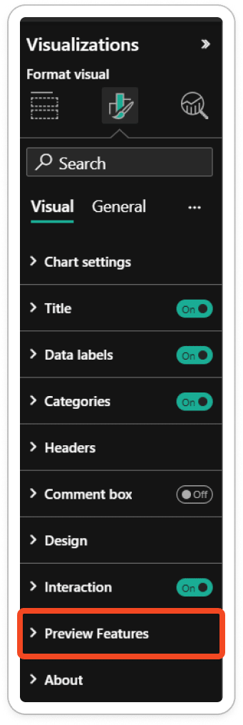 Preview features are now available for you to explore in this release. These early-access functionalities allow you to test new capabilities and provide us with your feedback before a full rollout. Please note that preview features may change or be removed in future releases. Preview features can be found in the Visual tab of the Visualizations pane.