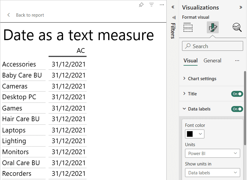 The date field in the Values bucket is now formatted and displayed in the visual as Date.