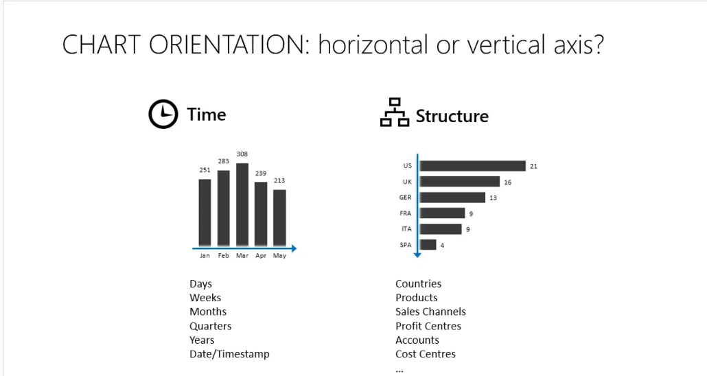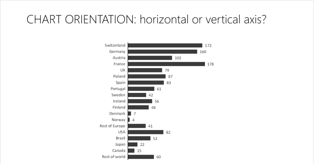 Most charts either have a horizontal axis or a vertical axis. When should you turn the chart around and use the vertical axis? The rule is very simple. If you're presenting time, like days, weeks, months, quarters, annual time series and so on, just use charts with a horizontal axis. Time goes left to right, and that's it. For everything else, like countries, products, sales channels, profit centers, and so on, always rotate the chart and use charts with a vertical axis.