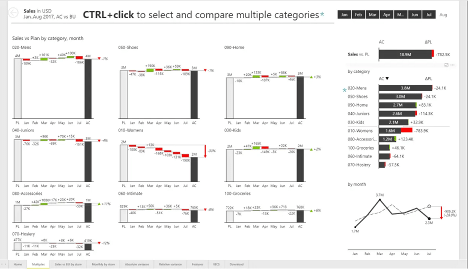 In a good dashboard, you should be able to click on this row to expand it and observe the details. Another option is to right-click data and drill through to another page that contains more detailed information about all stores or categories that explains what is going on.