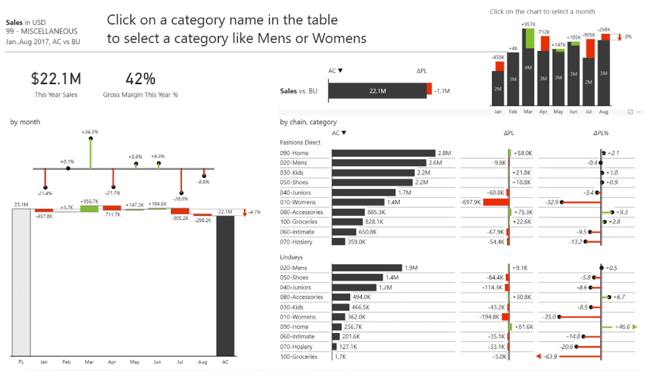 Women's clothing category is also under-performing in the other chain but to a lesser extent. You can easily understand not only what is good or bad, but exactly how bad itis. It's obvious that we must focus on women's clothing product category and take action.