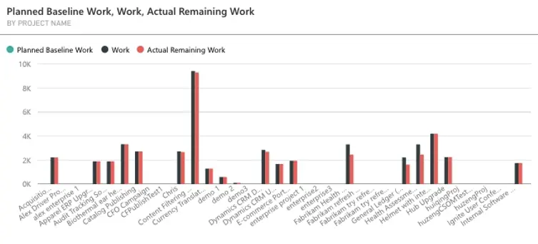 Below is a typical example of a chart that would benefit greatly from this quick fix. It's a project dashboard showing planned baseline work versus actual baseline work. It's showing the remaining work by project and not time. In this situation, you should just rotate the chart around and sort from the most important to the least important.